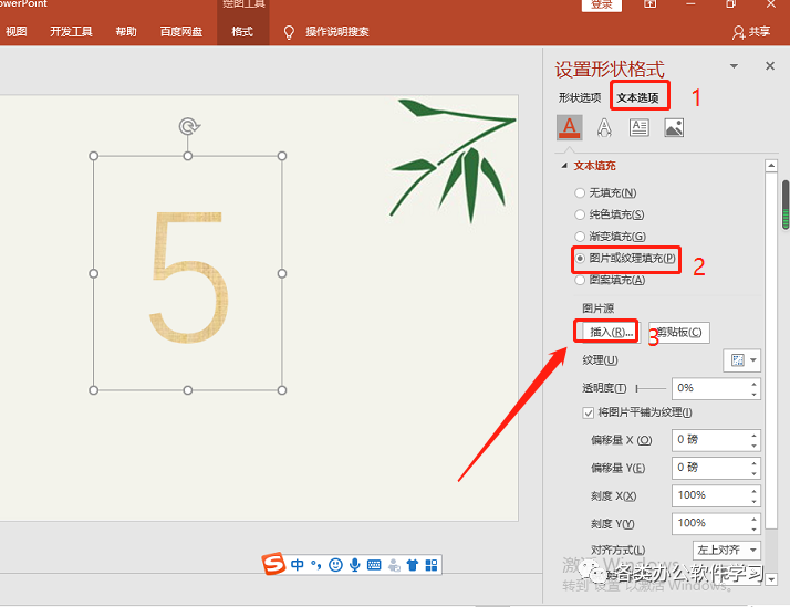 3、【文本选项】—【图片或纹理填充】—【插入】。(注:预先下载好图片保存至电脑,这里插入图片是用于填充数字效果,使其变成金黄色,放映时更加醒目)