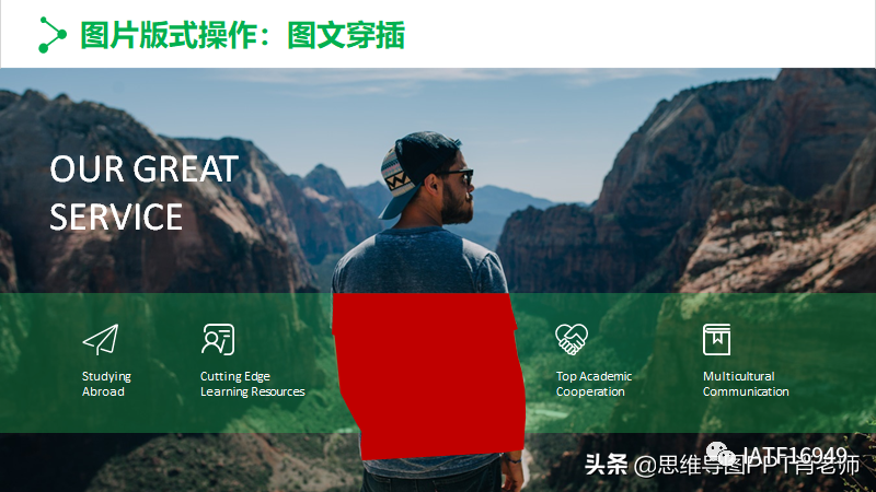 制作方法也简单,在母版视图中,设置图片为幻灯片背景,然后在幻灯片中,插入任意多边形,先勾勒出人物与蒙版之间重合的部分,最后点该多边形,在形状填充中选择“幻灯片背景填充”,搞定。