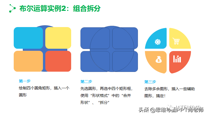 布尔运算,包括“结合、组合、拆分、相交、剪除”6种模式,注意,进行布尔运算时,是以选择的第一个图形为基础的,包括颜色、裁剪结果等,如下图,先选圆形、再选三角形,依次“格式-合并形状”操作即可,效果如下: