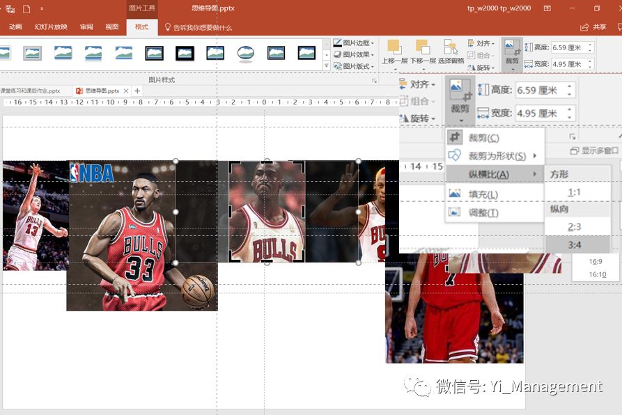 摆放完毕后,发现图片上下堆叠,很难看。这时候,引入“等比裁剪”快速裁剪每张照片。如下图,在【格式】中选择【裁剪】,选择纵横比“3:4”。
