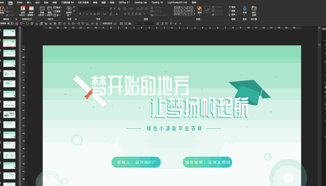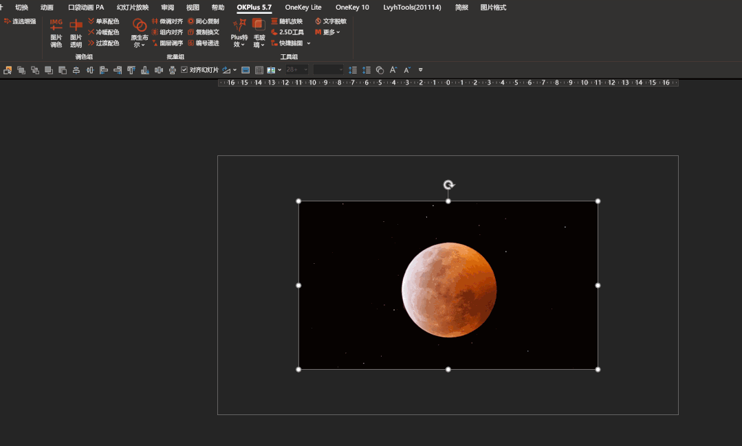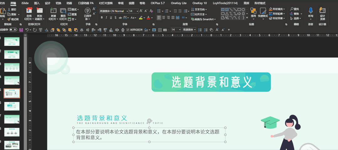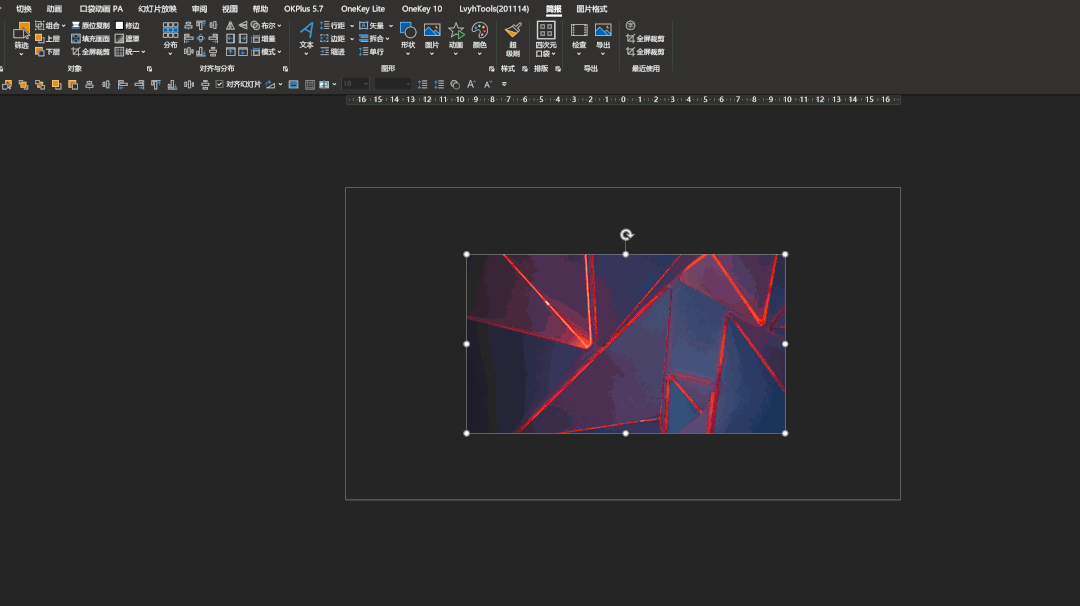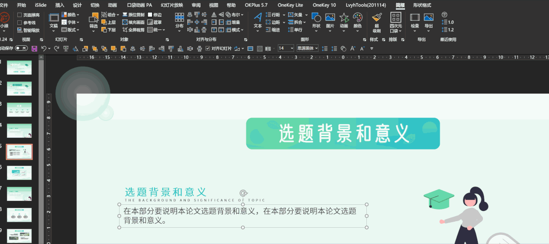 01. 文字篇 我们在做一些作品的时候,为了更有意境和凸显文字的韵律感,会把标题文字错落排布,例如下图这种: 这就需要将标题文字拆成一个个的单字,常规做法是把文字分别复制粘贴出来,但这样会比较费时费力,让我们来看看插件的一键完成: 选中文字-小顽简报中点击「拆合」-「拆成单字」,就完成啦~ 有的时候某些标题会做成特殊字体,但考虑到字体使用只有一两处,没必要嵌入字体,为了节省文件大小,就可以将特殊字体转为矢量形状。 PPT中的默认行距是1.0,1.5,2.0等,但我们一般使用的行距会在1.1-1.3左右,PPT默认行距其实用的很少。 所以每次调整行距都要点击好多次才能设置好,让我们来看看: 02. 图片篇 有时为了排版的需要,会将某些元素转为图片。最常规的做法就是复制,选择性粘贴为图片。而这样的做法看起来没什么,但经常用会发现,粘贴出来的图片位置会和原位置相距较远,导致还要再重新调整回原位置,就会很麻烦。而插件中可以一键实现在原位置转图: 选中要转图的元素-小顽简报中点击「图片」-「原位转图」 在做一页全图型PPT时,插入的图片往往不是16:9的。 这就需要我们裁剪图片比例,还要再放大图片,这样操作起来需要好几步步,还是会比较麻烦: 做PPT时如果图片和页面颜色不搭时,通常我们都会到PS中去调整图片颜色,然后再插入到PPT中。 但其实不需要这么麻烦,在PPT中也可以直接调整图片颜色。 选中图片-OKPlus5.7中点击「图片调色」-「导入图片」-相应调整色相,饱和度和亮度,调整后,点击「导出到幻灯片」即可 我们在PPT中插入一张图片后,有时会想让图片和背景变得更加融合,就希望图片边缘柔和并带一些透明度。 常用的做法就是到PS中去调整,其实PPT中可以直接实现。 选中图片-OKPlus5.7中点击「图片透明」-「导入图片」-水平方向调整参数,调整后点击「导出到幻灯片」即可 插件的小技法实在是很多,我这里也只是列举一些使用频率较高的小操作,帮助大家快速提升制作效率。