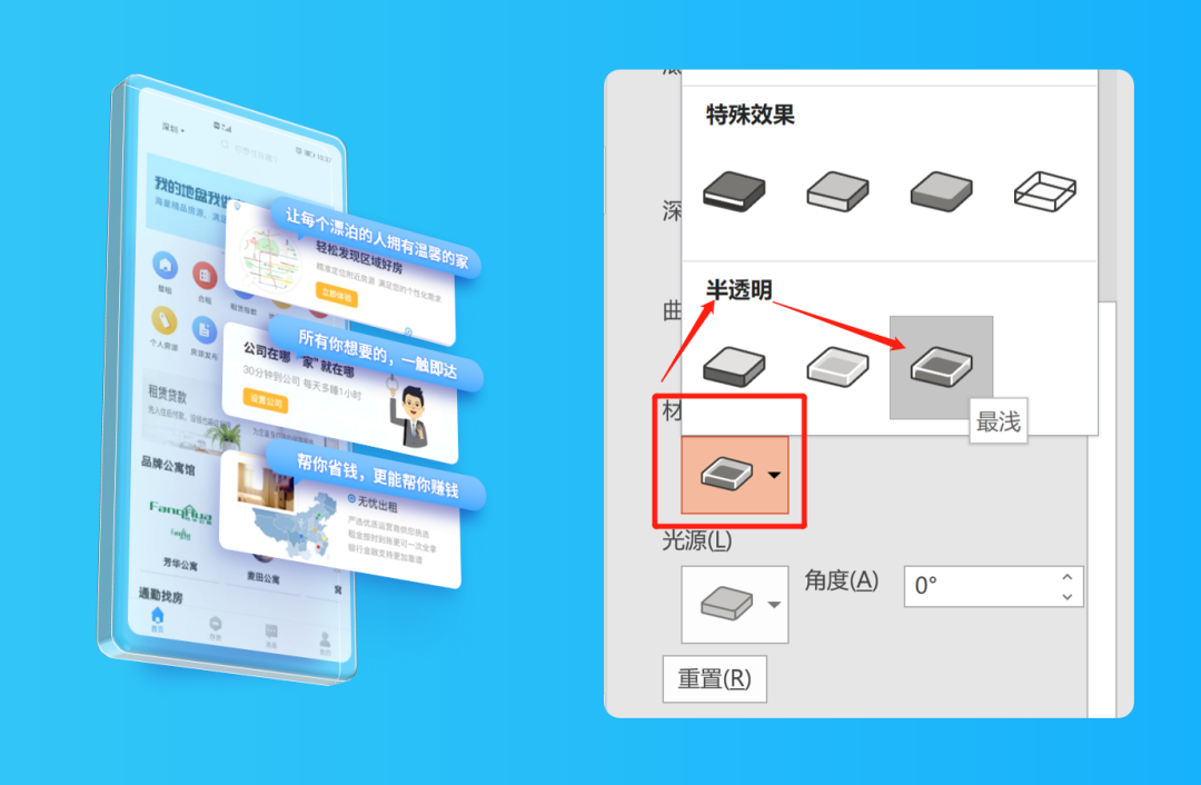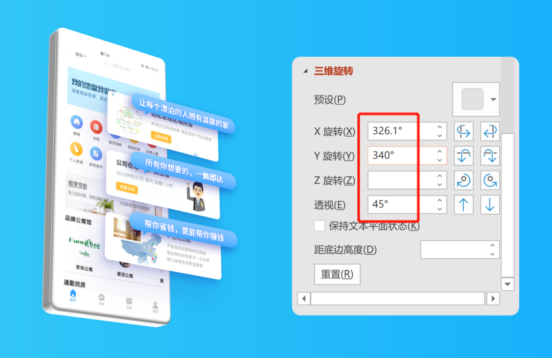看到标题你是不是在想: 徒手造手机??你在开玩笑吗? 哈哈!卖个关子~ 今天就由我们晶喵(蓝小晶),和大家聊聊“徒手(用PPT)造手机”的那些事儿~ 拿起工具,跟我一起“造”起来吧! 喵~大家好呀,我是晶喵。 大家在制作PPT的时候,是不是会经常需要展示一些手机页面截图呢? 为了使画面更有场景感、增加设计感,我们会用到【手机样机】来配合截图进行展示,就像下面两张作品。 (王牌P计划 第6期 @鱼酱) (王牌P计划 第6期 @山猪) 那么,问题来了!!! 如果现成的样机图片不符合我们的内容版式(比如角度不适合); 如果没有现成的素材,找起来会特别的浪费时间; 或者,没有网络! …… 还想做有样机的PPT页面,那该怎么办呢? (真令喵头秃) 别怕别怕,遇到这些问题,本喵交给大家一个解决办法,那就是:没有枪,没有炮,勤劳的双手来创造! 来吧,展示~ 看,这是我在参加王牌P计划时的一张作业。 这张作业的灵感,来自于下面这张APP介绍图片。 (参考来源:腾讯新闻APP介绍图) 透明的手机,是不是特别好看~ 可是比赛特别紧张,我没有时间再去找合适的素材,于是我就开动聪(mei)明(mao)的脑筋,找到了利用PPT自己绘制的办法。 (感谢艾迪鹅宝宝的友情客串) 那就让本喵来带领大家再制作一遍吧~ 01 制作前的探索 PPT当中有两个功能:三维格式、三维旋转 今天我们就利用它们给基础的形状进行格式调整,制作出一个透明的手机样机。 首先,绘制一个圆角矩形,然后在三维格式中给它添加棱台和厚度,让它从平面变成立体。 但是看效果,好像它还是那个圆角矩形,除了边上多了点阴影,没啥变化。 别急,本喵带你换个角度看世界。 让我们找到刚才分析的第二个工具——三维旋转。 按照这个参数给圆角矩形添加上旋转角度。 此时,我们就可以清晰的看到一个类似于手机的形状出现在我们面前。 到这里,我们就找到了可以自己绘制模拟手机的方法,是不是特别简单呢? 下课! 哈哈哈哈哈,怎么可能~ 我们还要一起来优化这个“手机”的展示呢~ 02 透明样机的制作 先奉上灵魂手稿~ 因为作业需要展示3句APP的相关标语,所以本喵设计了三个模块用来突出展示相应的功能。 然后将它们叠放在透明的手机样机上,搭配APP界面,这样一个手机APP展示页面的主体就构思完成啦。 在这里之所以要提前规划好所有内容,是因为我们要将所有的元素,按层级组合为多个整体,统一添加旋转,这样才会在旋转后角度和谐统一,并且方便调整。 构思完毕,开始动手制作。 首先,将我们所要用到的元素摆放好(其中底部的圆角矩形,是我们在探索的过程中已经添加好三维格式的形状); 然后,分层级将元素进行组合(圆角矩形+APP截图、3个功能模块、3条标语); 第3步,给每个组合添加三维旋转,并适当的调整位置,让层级关系更加明显; 在这张作业当中,本喵给样机设置了一个仰视的角度,看起来比较的高大上。 我们在调整三维旋转角度的时候,有一个小技巧,就是在添加x、y、z三个轴角度参数的时候,一定要一个一个的设置,基本到位了在进行交替的微调; 如果一开始就3个数值同时调整,一会儿就不知道该怎么转了(别问我为啥知道)~ 万一不小心整乱了,那就干脆全部都清零,再一次的去调整角度,直到旋转为我们想要的位置。 好啦,到这里,我们要搭建的主题基本上就完成了,下面要做的就是让手机变透明。 选中圆角矩形,然后在【三维格式】里面更改它的“材料”,为半透明→最浅; 然后,“手机”就透明了,但可以发现手机的侧边有点黑乎乎的,不是那种晶莹剔透的感觉。 那就继续,再来点“调料”。 我们可以看见在“材料”下面还有一个参数叫做“光源”,在保持圆角矩形被选中的同时点击“光源”,选择特殊格式→平面; 再看我们“手机”,是不是就干干净净,bilingbiling了~ (艾迪鹅宝宝过奖了呢!) 接下来,咱们再画两个渐变矩形,给“手机”当做阴影,增加场景感。 放上背景,丰富画面层次,突出强调主体,是不是就很有感觉了呢~ 某同学:“晶喵喵,背景上圆形边缘的波纹是怎么做的呀?” 本喵:“什么,这位同学,你想学习这个背景效果的制作?” 哈哈,本喵也给安排上。(自导自演结束) 03 纹理背景的制作 制作这种纹理背景,我们要用到的是PPT【图片格式】中的“艺术效果”功能。 首先,我们要绘制一个和PPT等大的矩形以及四个圆形(可以根据自己的喜好绘制哟); 分层解析一下,就是这个样子。 选中所有元素,Ctrl+C复制,Ctrl+Alt+V粘贴,选择粘贴为图片(PNG); 这样我们就得到了一张和绘制形状一样的背景图片; 在选中图片的情况下找到【图片工具-格式】的“艺术效果”功能,选择“玻璃”效果; 再看圆形的边缘,增加了纹理效果,就仿佛是透过水晶玻璃看到的景象。 好啦,“手机”也会做了,背景也会做了,让我们添加上文案; 再添加“亿”点点细节,渲染氛围; 这样一个自己绘制手机样机的APP介绍页面,就制作完成了。 分析一下这张作业:中心透明手机,搭配功能模块图片,打造层次,制造场景感; 自制背景强调主体,配合文案,突出内容。 我是总结 今天的PPT小技巧,大家都GET到了吗? 我们主要利用了PPT的“三维格式”“三维旋转”和“艺术效果”三个功能进行素材的绘制和处理。 学习了制作透明的手机样机和绘制玻璃纹理质感的背景,大家学会以后一定要灵活运用起来哟~ 毕竟软件的操作一学就会,而有趣的创意需要多多思考。 期待着大家的佳作,我