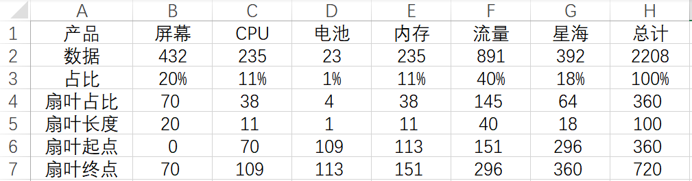 扇叶占比,即扇形区域,扇形区=当前值/总和x360,B4=ROUND(B3*360,2)