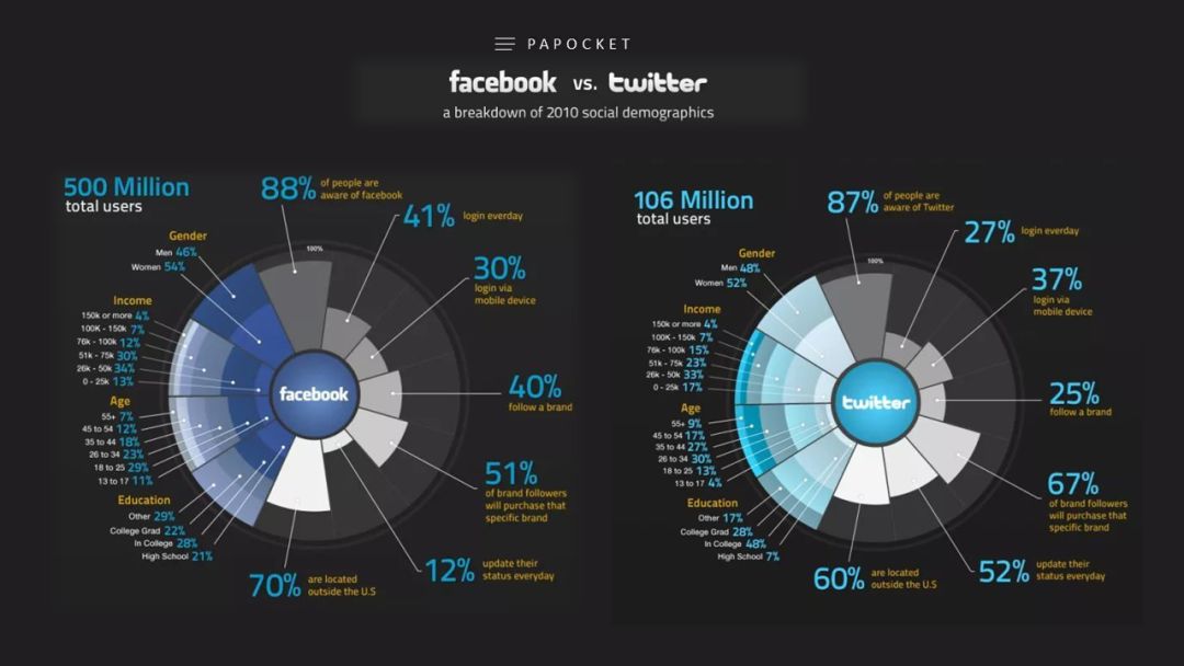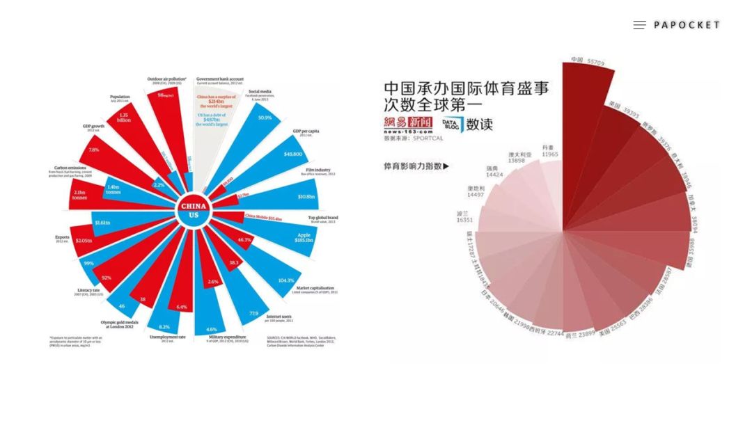 这类图表的数据呈现效果非常好,号称是一种老少皆宜、且高级的表达图表,在我们日常生活中的一些数据报告中也是比较常见的。