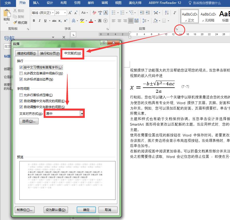 答:点击公式所在段落,打开段落设置窗口后,切换至中文版式,将文本对齐方式改为【居中】