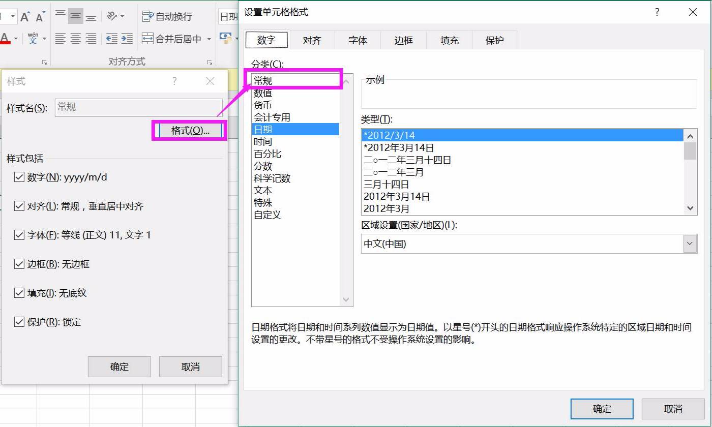 答:很可能是默认的单元格样式中数字格式被改成了日期。选中异常区域,按下面的方法,将默认单元格样式恢复成常规格式。