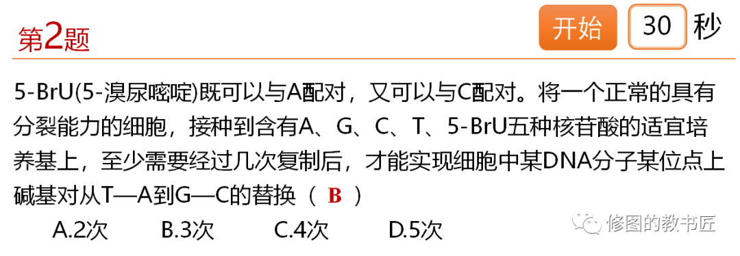 第2题比较难,假如学生用30秒才可以做完。在PPT播放状态下,单击开始(其实只要单击鼠标就可以了),数字就开始倒计时显示,直到数字显示0时,计时结束。教师可以提问学生,学生回答后,教师单击鼠标,给出答案。