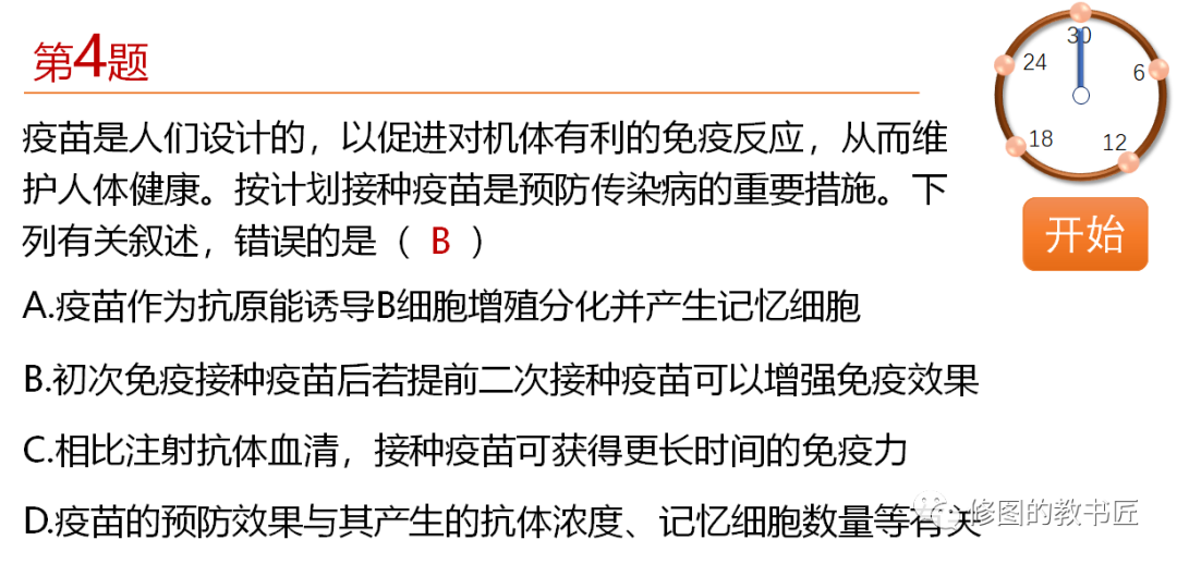 第4题比较简单,假如学生用30秒才能做完了。在PPT播放状态下,单击开始(其实只要单击鼠标就可以了),指针开始顺时针转动,直到指针重新回到30秒的位置,计时结束。教师可以提问学生,学生回答后,教师单击鼠标,给出答案。