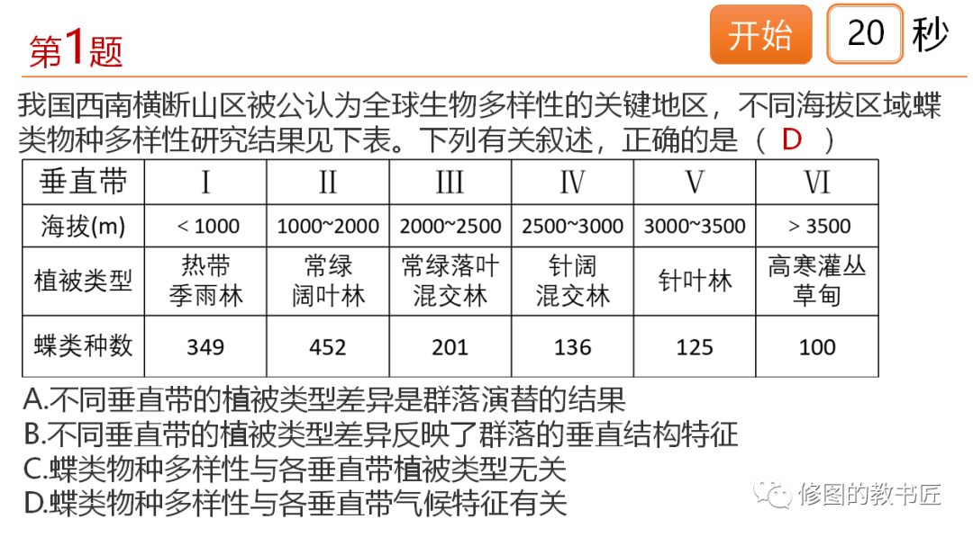 第1题比较简单,假如学生用20秒就可以做完了。在PPT播放状态下,单击开始(其实只要单击鼠标就可以了),数字就开始倒计时显示,直到数字显示0时,计时结束。教师可以提问学生,学生回答后,教师单击鼠标,给出答案。