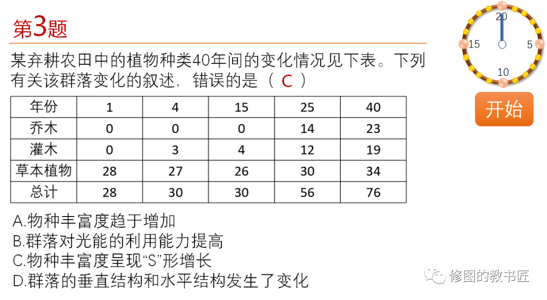 第3题比较简单,假如学生用20秒就可以做完了。在PPT播放状态下,单击开始(其实只要单击鼠标就可以了),指针开始顺时针转动,直到指针重新回到20秒的位置,计时结束。教师可以提问学生,学生回答后,教师单击鼠标,给出答案。