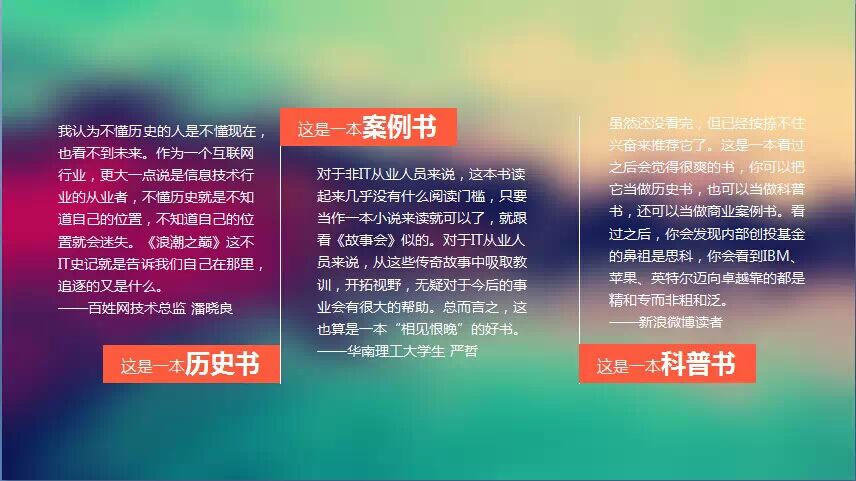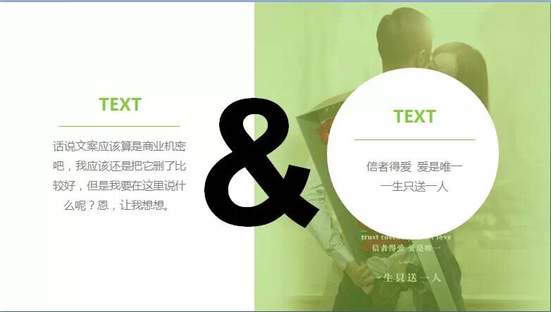 大家肯定都有过这样的经历:把白色的字放在浅色的背景上,明明在自己的电脑上可以看得比较清楚,放在教室里的电脑上、投影到屏幕上,却彻底融入了背景色之中,根本看不出来。这简直就像是在淘宝买了件蓝衣服实际到手的却是绿衣服一样啊。这是因为每台电脑的显示器都不一样,投影仪的效果也不一样,没有办法保证同一个PPT放之四海看起来都是一个模样。为了避免这种尴尬的窘境,你在设计PPT时一定要注意文字与其背景颜色的差异,差异越大,就越保险。使用白色字体时一定要自问:“这个背景颜色足够深了吗?”使用黑色字体时则自问:“背景颜色是不是太深了?”尤其注意当下很流行的IOS风格磨砂感模板,在并不很深色的背景上使用白色字,你确定你使用的投影仪能办到吗?