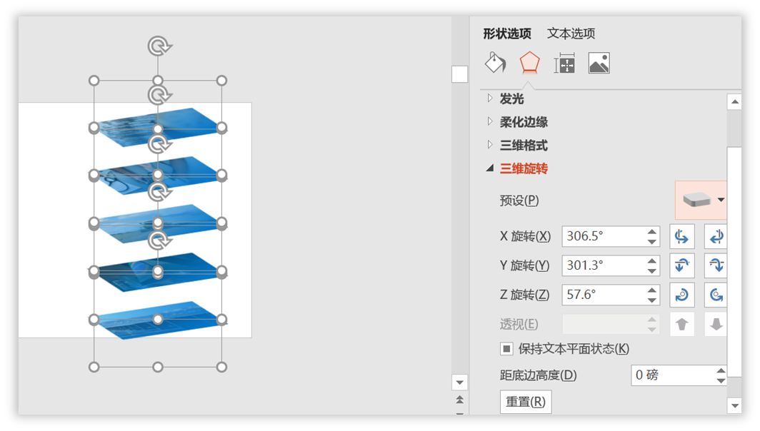 选择带有蒙版的图片,然后再选择【三维旋转】—【平行】—【离轴1:上】。