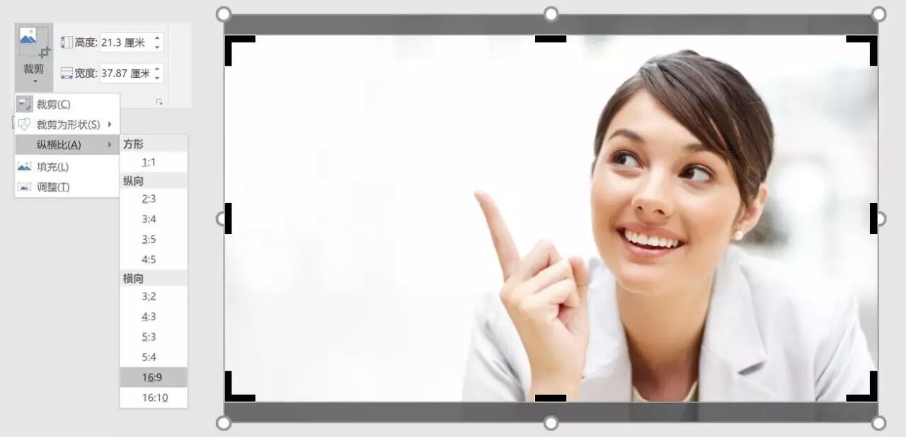 如果你的页面是16:9、16:10、4:3等标准的比例,还可以直接使用比例裁剪,点击裁剪按钮下方的小三角,选择纵横比,然后指定好比例(如16:9),裁剪框会自动收缩到对应的比例位置: