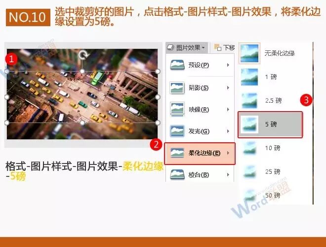 10、选中裁剪好的图片,点击格式-图片样式-图片效果,将柔化边缘设置为5磅。