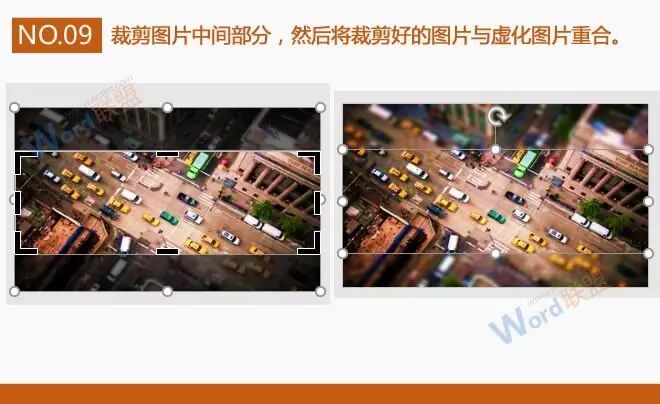 9、裁剪图片中间部分,然后将裁剪好的图片与虚化图片重合。