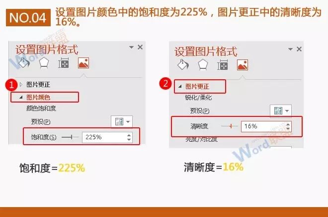 4、设置图片颜色中的饱和度为225%,图片更正中的清晰度为16%。