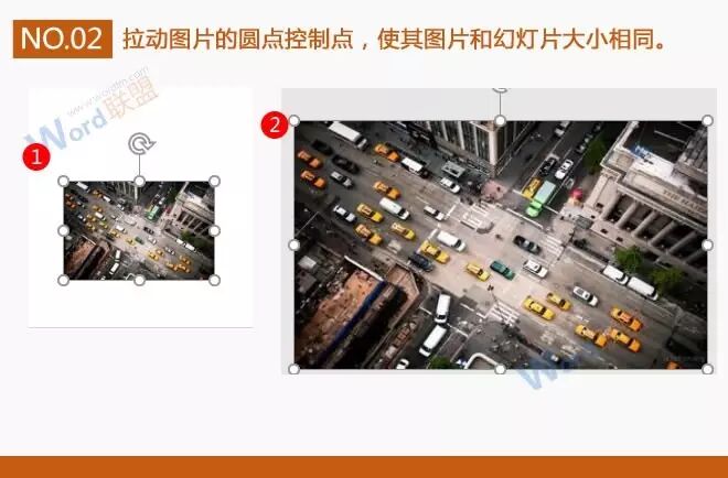 2、拉动图片的圆点控制点,使其图片和幻灯片大小相同。