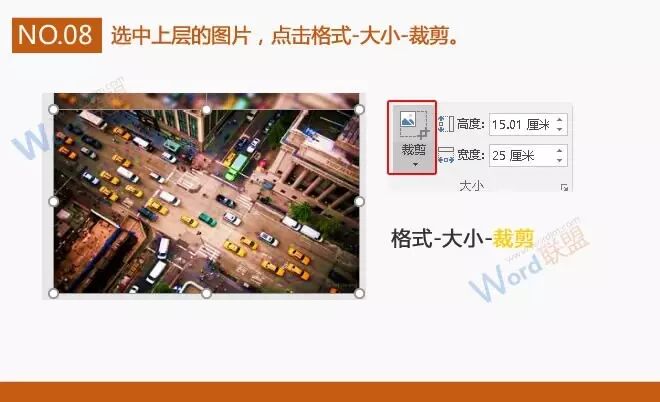 8、选中上层的图片,点击格式-大小-裁剪。