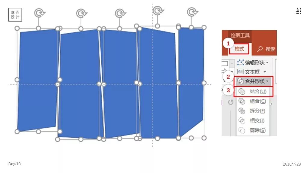 第二种:全选这些形状,在绘图工具,格式里面找到合并形状,联合,再将图片和联合后的形状进行相交处理即可;也可以选择联合后的形状使用图片或纹理填充。