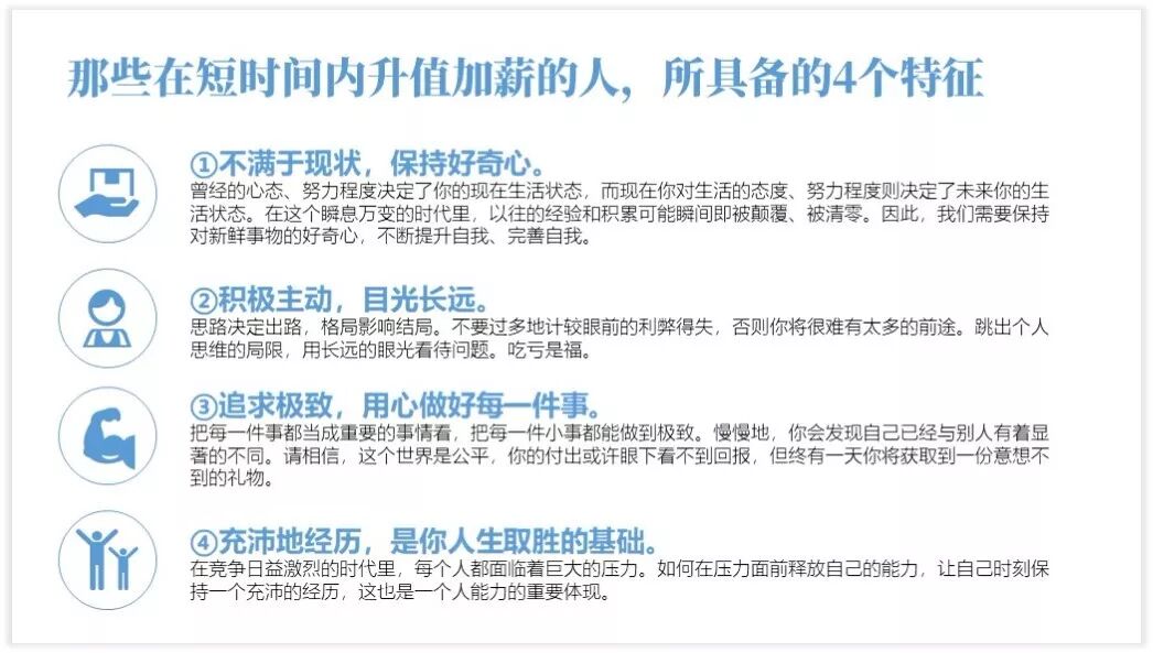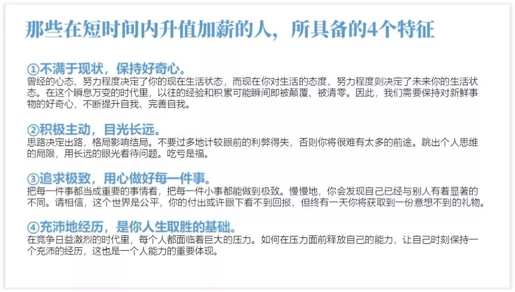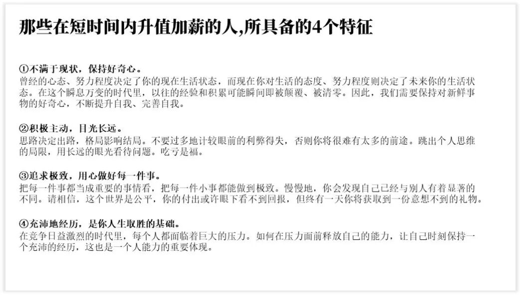 多文型PPT的第二步就是“突出主题”,就是将PPT中的核心观点突显出来。通常突显的方法就是将核心主题进行加粗、加大、改变字体处理。上述案例处理后的结果如下: