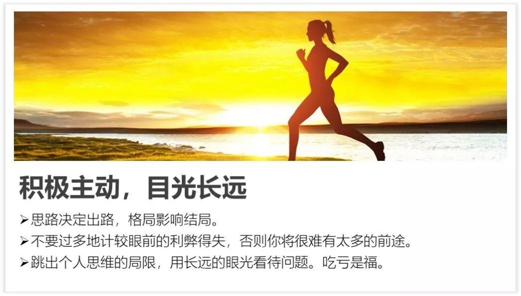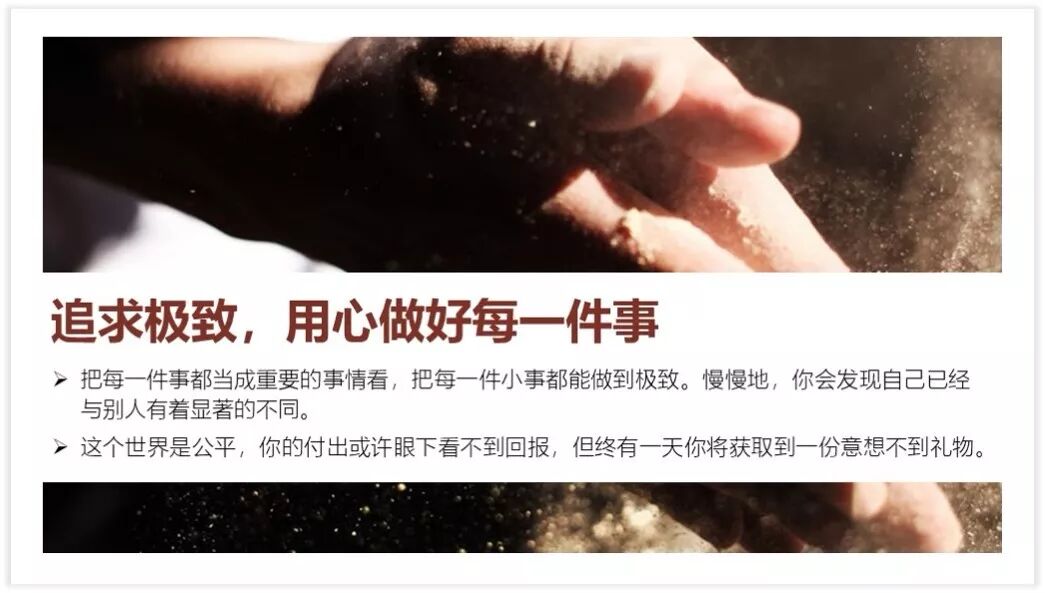 一份多文型PPT通过上述四个步骤的处理,基本能够提升一个档次了。但还有一种处理方法就是“化少为多”,就是将一页PPT中的文字分摊到不同PPT页面中,然后再对每一个PPT进行排版处理。上述PPT处理后的效果如下: