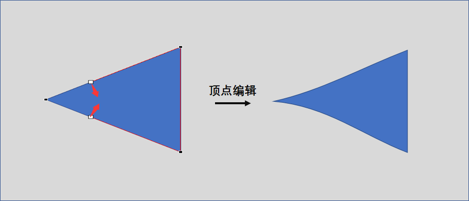 插入大小合适三角形,旋转使其按如图所示摆放,右键点击顶点编辑,选中左边定点出现两个方形,鼠标左键点击向内移动使两条边有一定弯曲幅度。