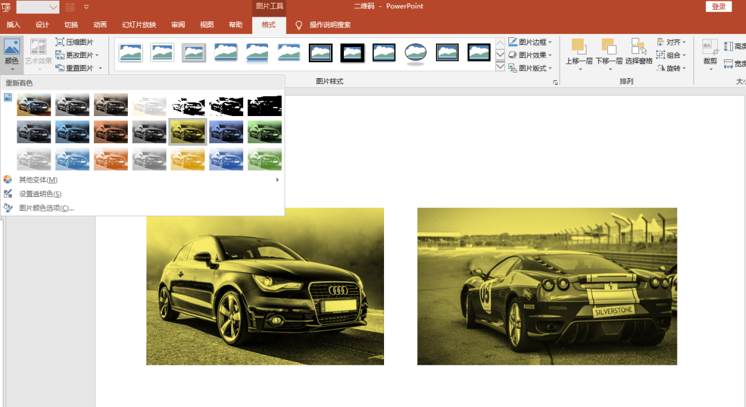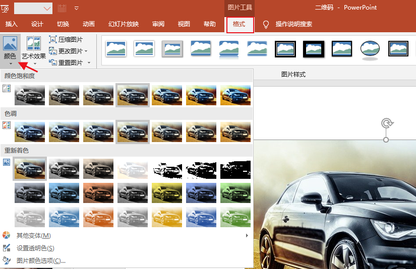 点击图片-【图片工具】——【格式】——【颜色】,点开来就是下面这个样子: