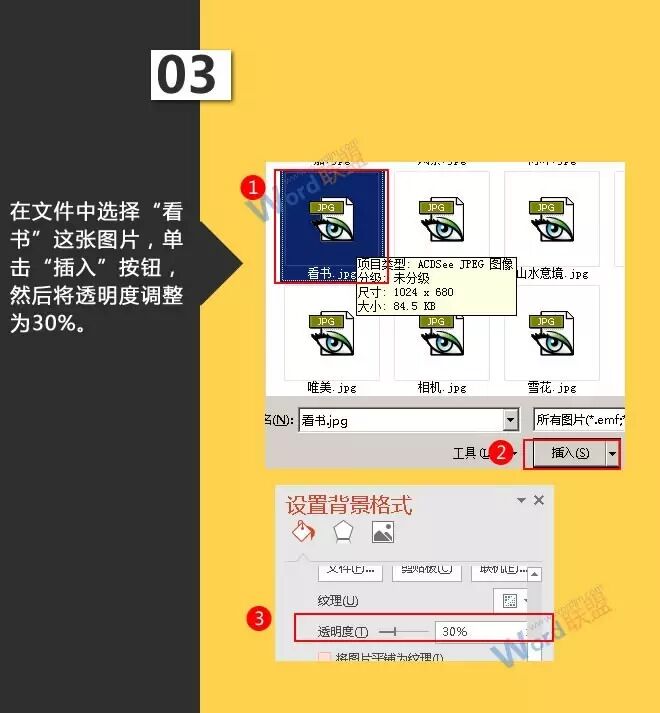 3、在文件中选择“看书”这张图片,单击“插入”按钮,然后将透明度调整为30%。