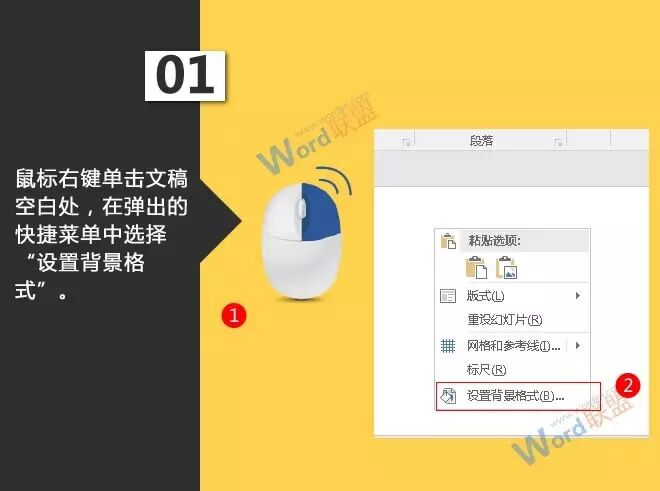 1、鼠标右键单击文稿空白处,在弹出的快捷菜单中选择“设置背景格式”。
