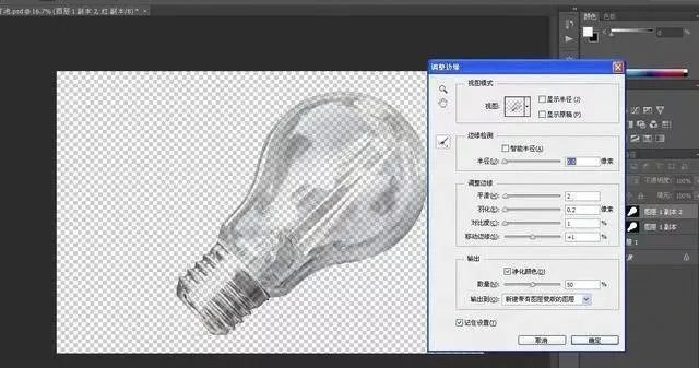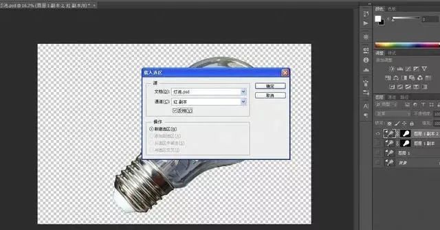 制作这个效果其实非常的简单,一点都不复杂,实际只需要将人物抠取出来,然后通过图层模式融合就可以了。 主要注意两点:1,合成创意。2,半透明区域的扣像。 效果图: 一,灯泡的扣取。 1,灯泡整体扣像,打开素材,放大用磁性套索工具扣取灯泡。 2,半透明区域扣取。转换到通道面板,复制红色通道,回到图层面板,载入选区(反相),用调整边缘输出带蒙版的新图层。 3,拖入背景。 二,人物扣取。 三,合成。把人物图片拖到灯泡里,并调整到合适的大小和位置,混合模式用滤色。