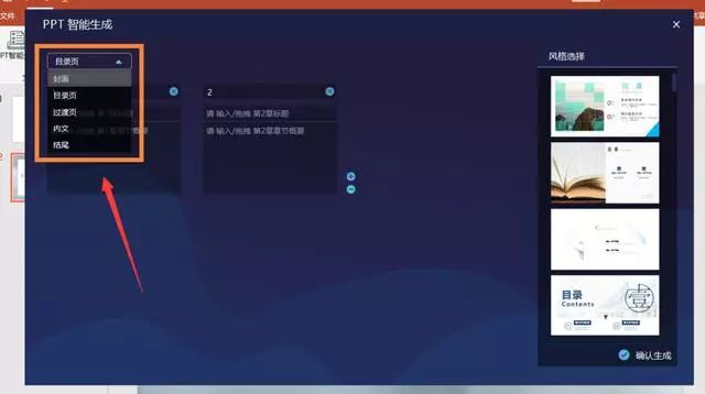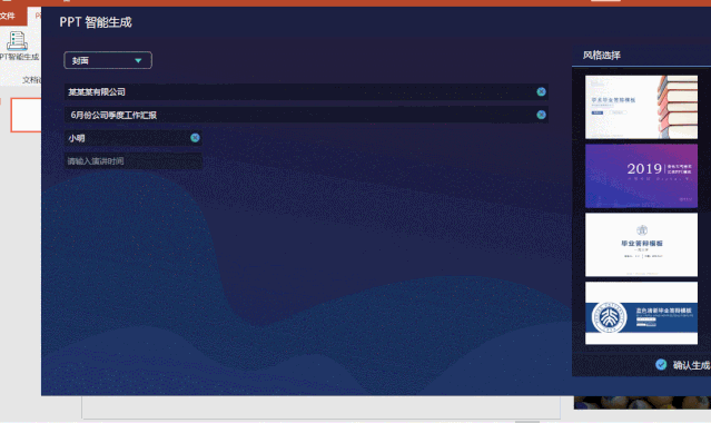 点击【PPT智能生成】,首先我们制作PPT的封面,在里面输入PPT的主题、汇报人、时间,然后在右边找到PPT封面图的风格,最后点击右下角【确认生成】即可
