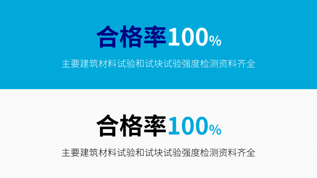 从正文里我提取出了关键词“合格率100%”,一般我会把这类关键词单独拎出来分为两行,并放大字号,这样就形成了字号对比、文字长度对比: