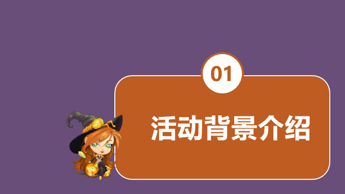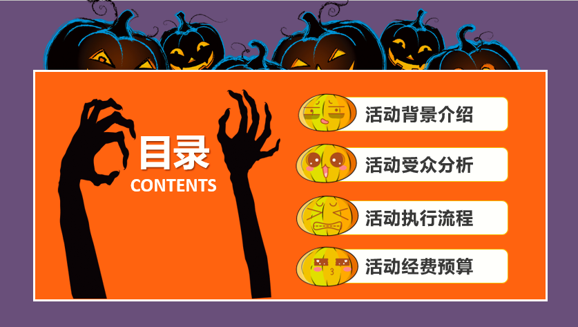 继续就是关于用PPT制作“万圣节”的目录页了,操作方法和刚刚幻灯片页面相似,我们利用图层重叠的原理,在矩形的上方和下方添加不同的图案,最后将整个内容的大纲目录提取出来,比如活动背景介绍、活动受众分析、活动执行流程、活动经费预算。具体大家可以根据自己的实际情况来进行调整。