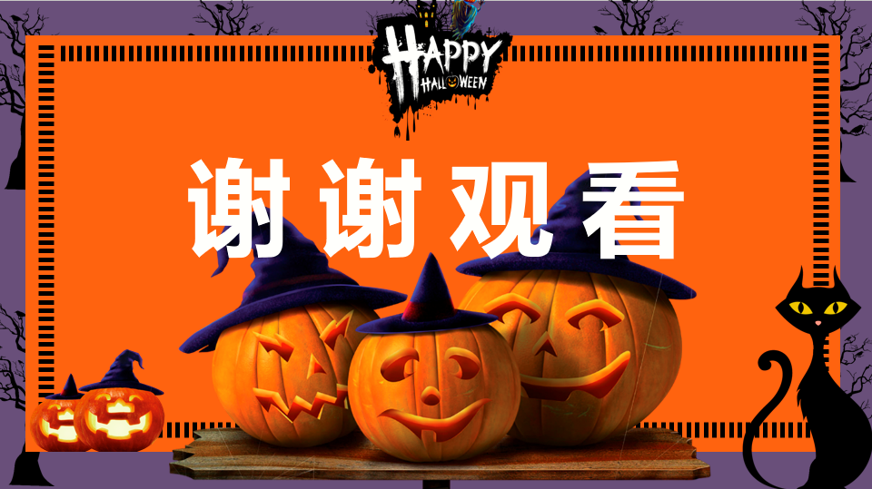 中间的正文页就不给大家秀了,小编要忙着去过万圣节了,再不去活动就要结束了,今年的万圣节比以往更加有趣,不要问为什么,因为别人戴的是面具,而我带的是PPT。最后附上结束页面供大家欣赏。