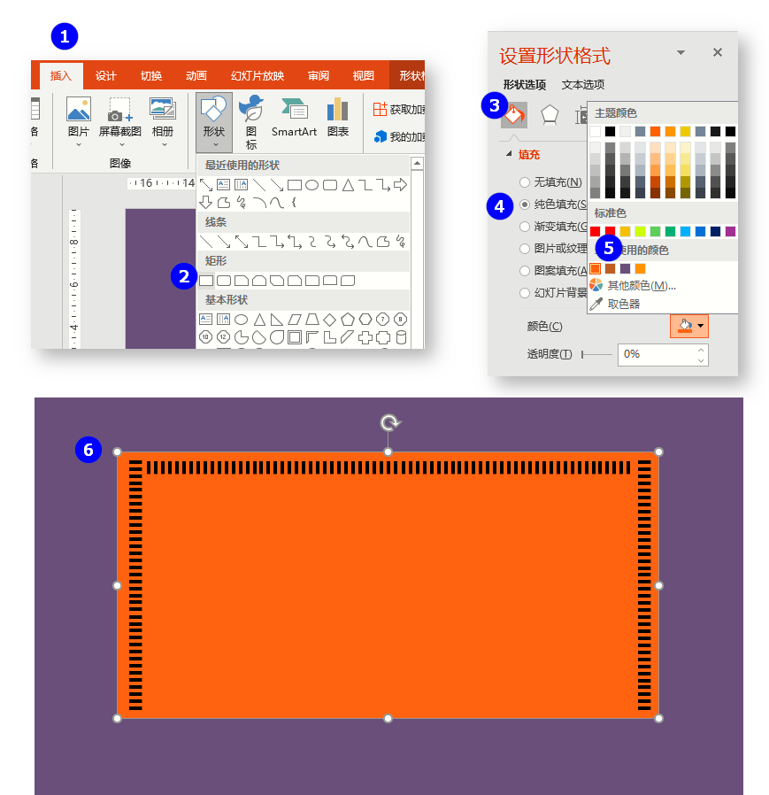 接着在刚刚自定义好的背景页面上插入一个矩形,并且给矩形填充一个颜色,在矩形的上方设置黑色条纹块状的形状,沿着矩形的上方和左右来进行分布。