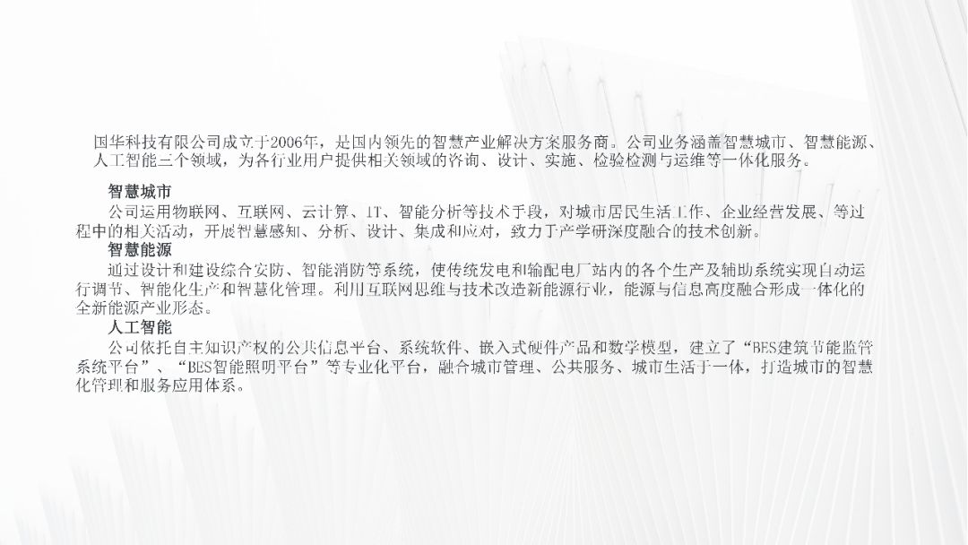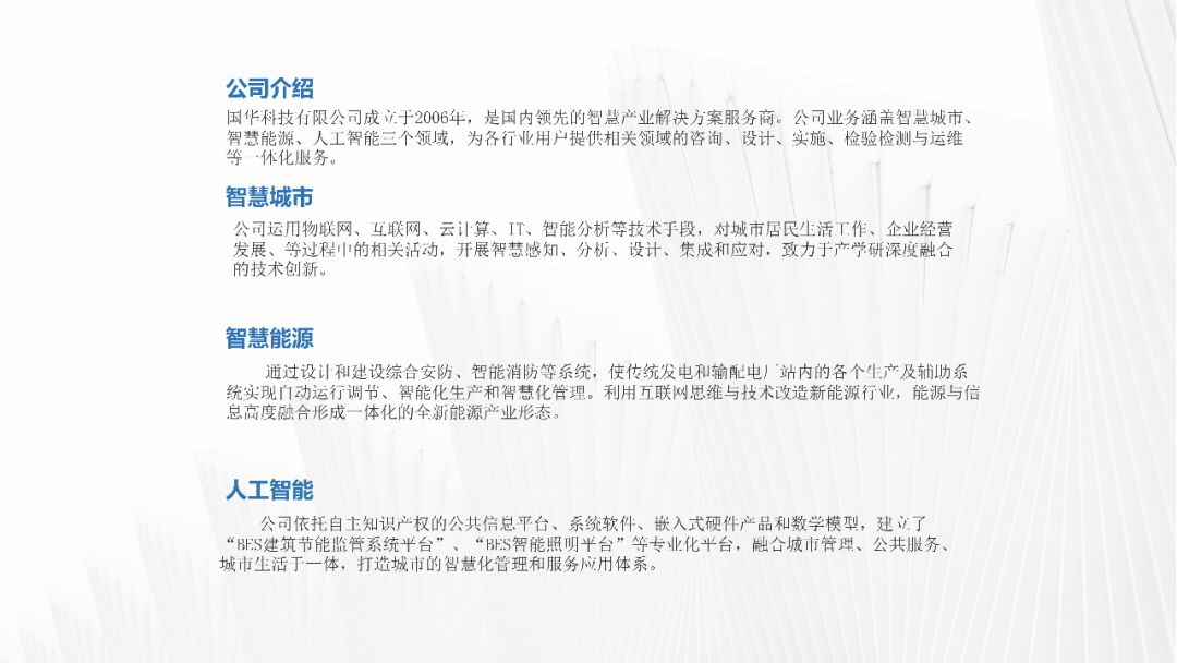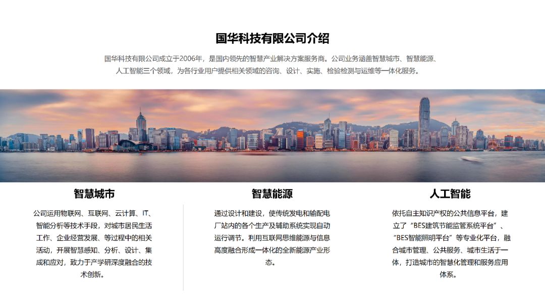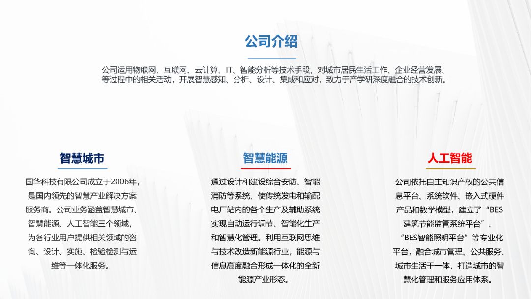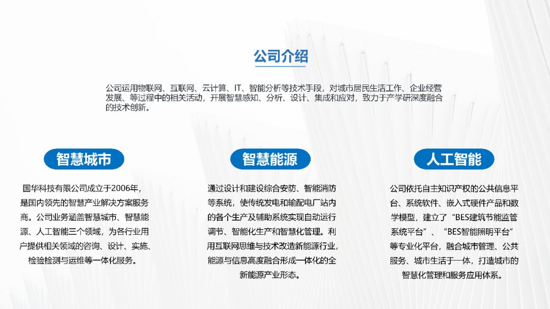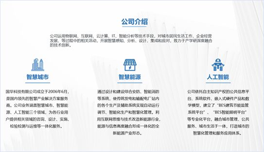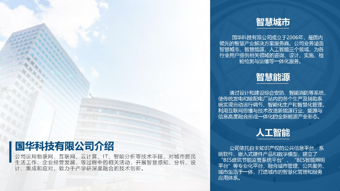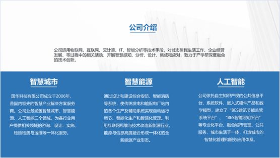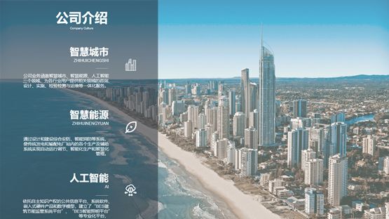 下面这张PPT采用左右排版的方式,左侧将公司简介搭配公司相关图片,并添加一张蒙版;右侧采用分离式图片的设计,插入一张与主题相关的图片,添加透明度较高的蒙版,再添加公司介绍的分支内容,效果如下图: