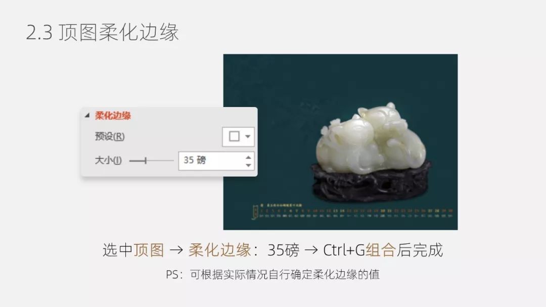 2.3 给顶图(不规则形状)添加35磅的柔化边缘。请注意,柔化边缘的值与图片大小一般是正比关系,即:图片越大,柔化边缘可能需要设置的更大一些;反之,设置的小一些即可