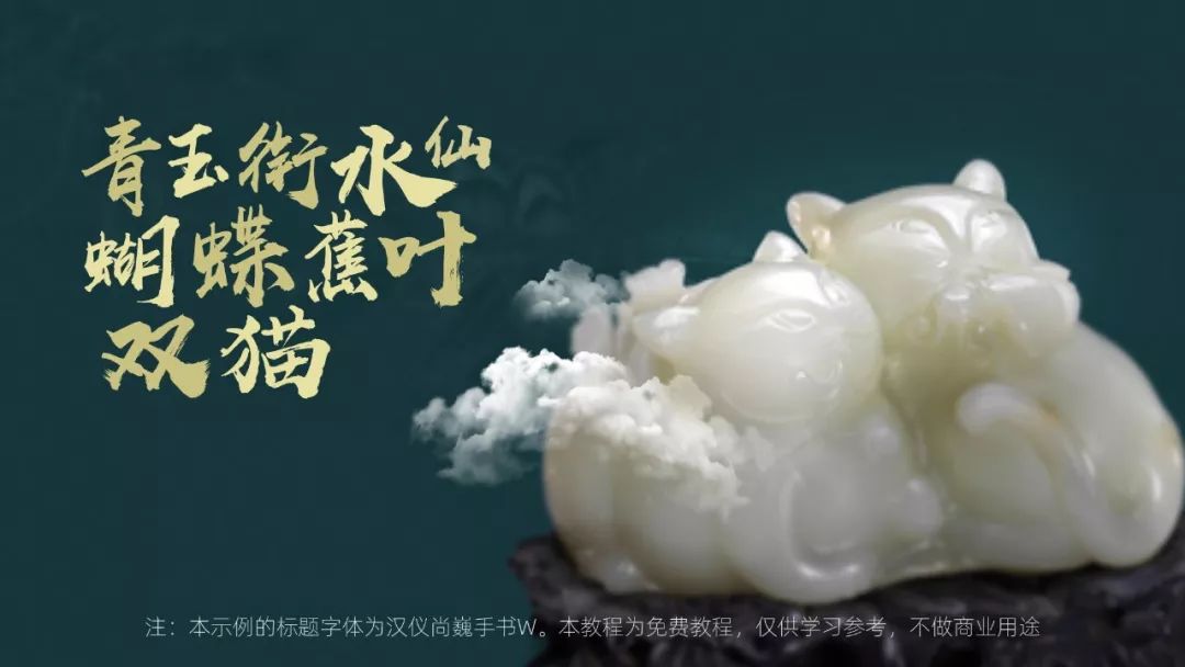 说明:图中的文物叫做:青玉衔水仙蝴蝶蕉叶双猫。标题所用的字体为:汉仪尚巍手书W。另外,我加了点云的素材作为点缀