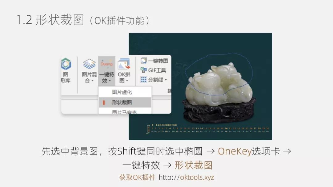 1.2 使用OK插件的形状裁图,将不规则形状对应位置的图片区域快速填充到形状中。如果没有插件的话,可以使用布尔运算,或把图片复制后通过剪贴板粘贴功能填充到形状中后手动偏移