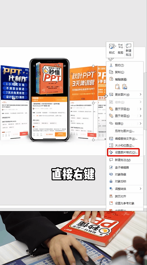 ❸ 先选中图片,点击鼠标右键,选择【设置图片格式】,点击【三维旋转】直接设置参数,就可以让图片「翻转」起来了;
