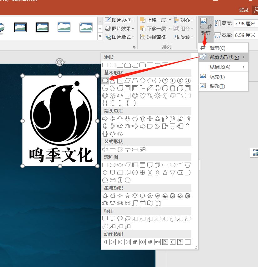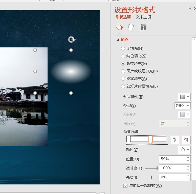 PPT实战P图案例(三)—— 做logo(头像)圆图 有时候我们需要这样的正圆形图片来做头像,或者是作为PPT里的元素来使用。 但是我们手头的素材图,是这样的。那么怎么才能做成上面那种正圆形的图片呢。 这里,我们首先需要用到裁剪工具。上节课说过,我们点击下面的小三角,可以为裁剪选择形状,这里我们选择圆形。 但是我们会发现,效果并不如意,而且也不是正圆。 这时候,我们先来把圆调成正圆——不用手工去拖动,那不科学——我们继续点击剪裁下面的小三角: 为裁剪选择纵横比——1:1 这时候我们就看到裁剪区域就变成了正圆形。 接下来,我们按住Shift键拖动图片区域,来调整图片的大小。 按住Shift键的作用是,使图片在缩放过程中保持等比,图片不会比例失真。 然后我们直接点击图片区域并把它拖动到合适的位置。 我们注意到,这时候虽然剪裁区域是圆形的,但是实际周围都是透明的。 聪明的同学已经能想到,这里就用上节课的方法就行了——给图片设置填充颜色。 为了方便大家看最终效果,这里我给它加个阴影。 然后我们将图片另存为PNG格式,即可: 到这里就完成了。 PPT实战P图案例(四)—— 照片修饰 除了以上这些例子,其实PPT还能通过叠加形状的方式,来进行很多图片粗加工,只要大家发挥想象力,很多效果都是可以用PPT做到的——比如给照片加高光、加阴影、打马赛克。 这些我就来简单讲讲思路: 比如这里PPT里有一张照片。 高光和阴影,都是通过叠加路径渐变的形状来完成的: 我们这里画一个椭圆,给它填充上白色到透明的路径渐变效果。 我们把它置于顶层,然后放到需要加高光的区域即可。 加阴影也是同理,叠加一个深色到透明的路径渐变形状即可。(为了效果好,建议深色部分透明度调高一点,如果觉得阴影不够,可以多叠加几次形状。上图为了给大家看清楚,透明度调得比较低) 对比一下图片,是不是就完成了我们想要的高光和阴影效果。 至于加马赛克,我们之前讲图片艺术效果时讲过——原理就是复制一次图片,把他剪裁到马赛克的区域大小,然后图片艺术效果选择虚化。 比如这里我们想给桥打上马赛克,就复制了一次图片,给复制后的图片剪裁到桥的区域。 拖动到对应位置后,为它选择虚化图片艺术效果。 以上就是使用PPT来P图的技巧!技巧实际都很简单,大家要多多尝试。 以后做简单的P图就用我们熟悉的PPT就好了!