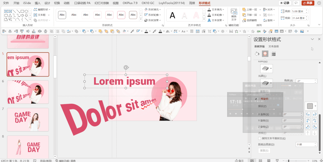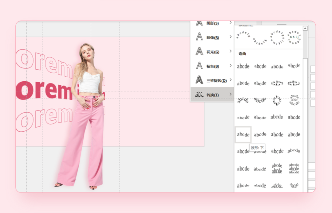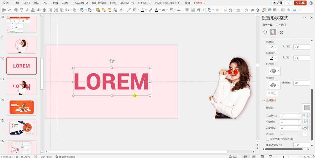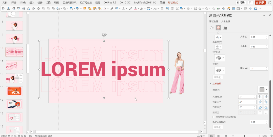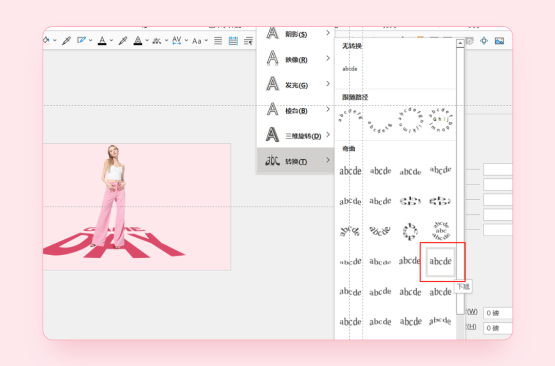 依旧是先使用文字转换功能,再用三维旋转调整到合适角度: