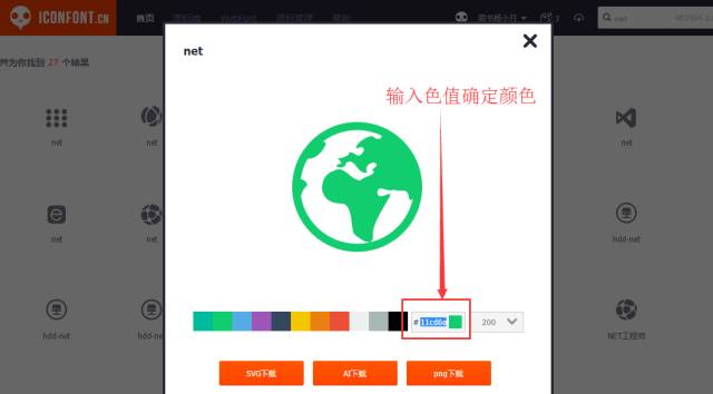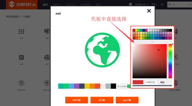 Iconfont提供了调色板和色值输入两种方式来精确设定图标的颜色。