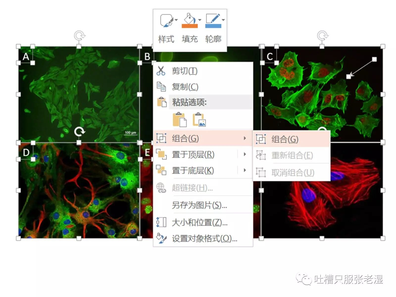 3、Ctrl+A选择所有图片和标注,在图片范围内右击-组合-组合(快捷键为ctrl+G,组合也是个很有用的工具,多用用),使得图片和标注成为一个整体(其中单个元素仍可编辑)。