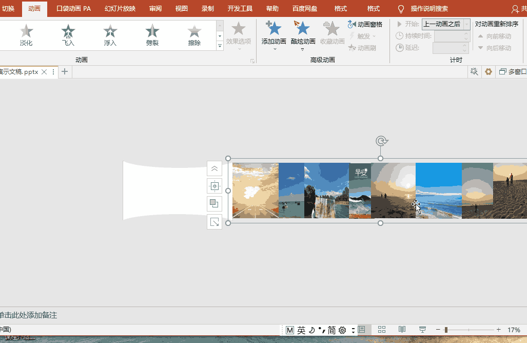选中图片,添加一个向左的进入动画,向左右两边拖动调整,动画路径