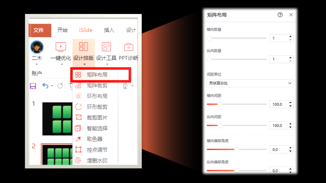 不要觉得这技巧作用不大,还有更厉害的呢,借助 iSlide 的「矩阵布局」功能甚至能更细节的设置参数:
