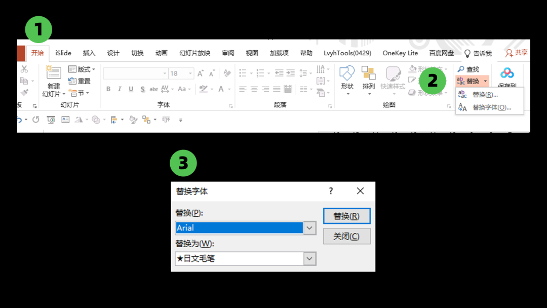这个时候莫得慌,打开 PPT,在开始菜单中找到「替换」之下的「替换字体」。