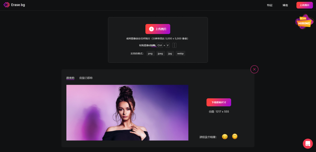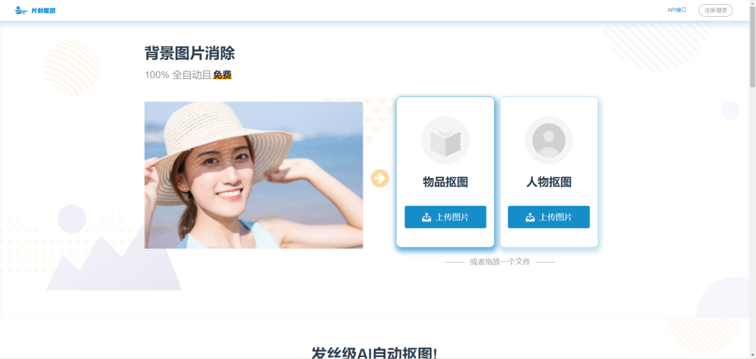 号称“发丝级AI自动抠图”,目前使用完全是免费的,扣取人物的细节还是蛮好的。
