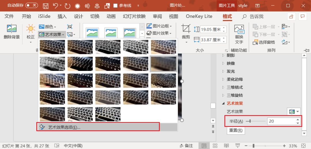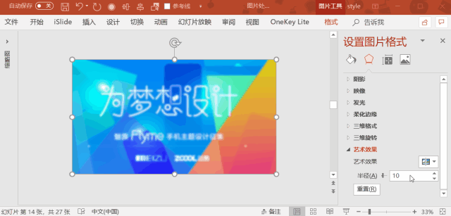 在艺术效果选项中,把半径设置为100,立马就生成了一张渐变背景: