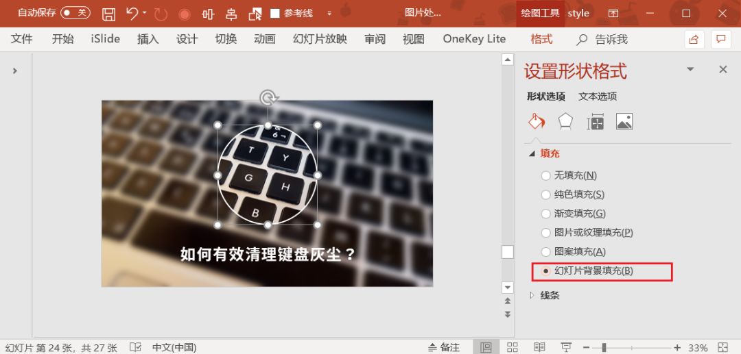 第三层是形状层,使用的形状其实就是最常见的圆形,而最重要的操作是将圆形的填充效果设置为“幻灯片背景填充”,